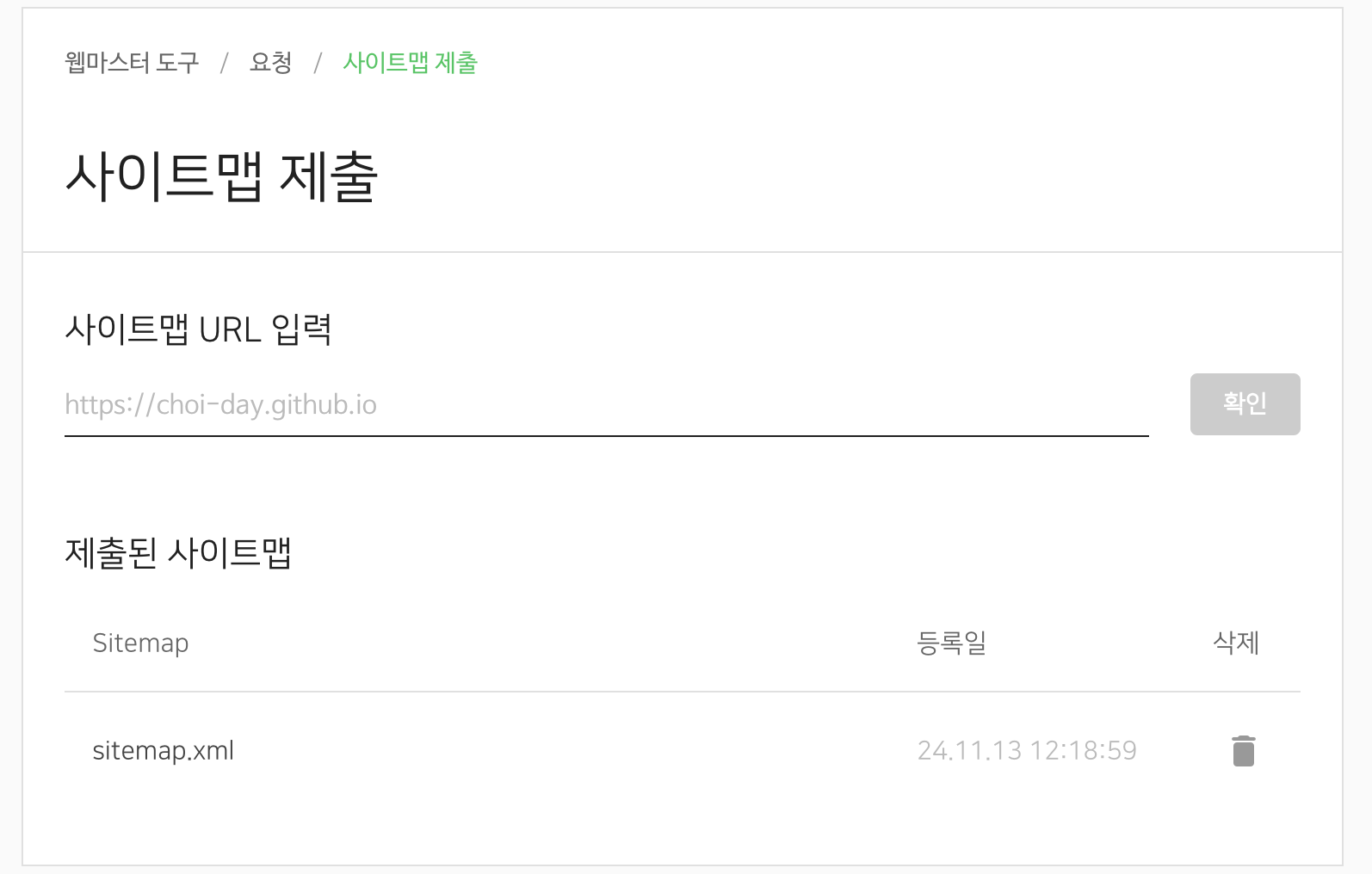 - 사이트맵 제출에 블로그주소.sitemap.xml 작성 후 확인